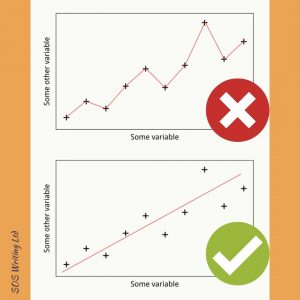 Let’s have a look at Fig. 2 as an example of the right and wrong way to analyse a figure. On the top, you can see a common mistake made by students, especially if they’re using Excel for their data analysis. They often connect each of their data points, either with lines or splines, but this approach doesn’t really tell you anything beyond “as some variable increases, some other variable does too”. This is a qualitative description of literally what the graph shows, but it’s not a very deep or insightful statement, and it doesn’t tell us anything about the science underlying the results. A basic quantitative approach would be to think about the expected relationship based on the key equations the experiment is based on. Let’s say that the relationship is expected to be linear, and let’s recognise that the data points appear to show a linear relationship. At this point, we can then calculate a line of best fit to find out the gradient – then you know by how much “some other variable” increases as a function of “some variable”, and can then discuss the degree to which your results agree with the theory. Even better might be to perform linear regression, which would also give you an estimate of the gradient, but would also tell you how tightly correlated the variables are, and thus how good the fit is. Having a chat with your lab helper about the analysis you want to do will help a great deal, so start working on your analysis early and get some advice/feedback about whether it’s appropriate for your work.