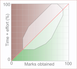Actually at the low end of the scale, it’s true that the marks you get are more-or-less proportional to the effort you put in. At the higher end, it’s almost impossible to get 100%, because there’s always something you can do better. Based on my own years of experience in marking lab reports, the majority of students sit in the pale bounded blob in the middle of the graph. The region of this blob above the red line represents those students who put in a lot of effort (but who get lower marks), while the region below shows students who get better marks for less overall effort/time invested (which is where you want to be). At the start of term there are always more students on the brown side of the blob, but moving to the green side requires working smarter, not harder.